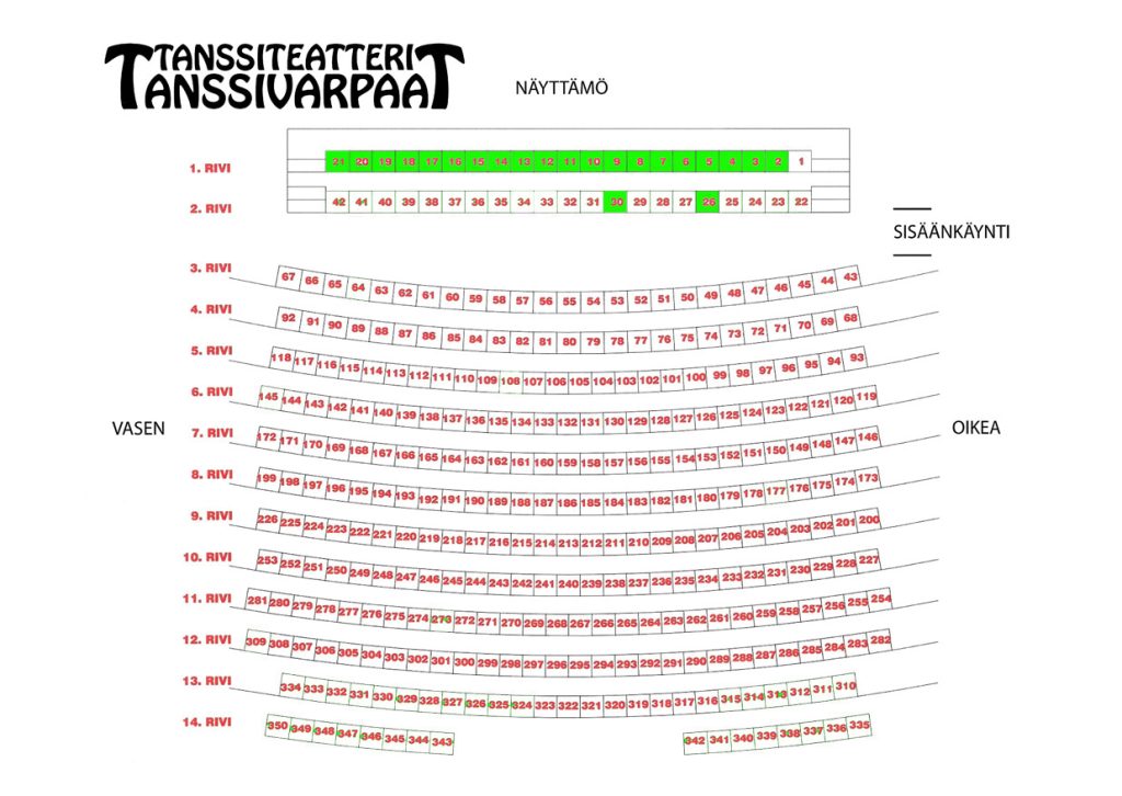 Alla katsomokartta, vapaat paikat vihreällä värillä